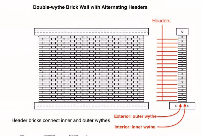 - Solid brick masonry typically consists of inner and outer brick walls (called “wythes”), connected to each other with header bricks. Header bricks are bricks turned 90 degrees so that one end of a header brick is mortared into the outer wythe and one end into the inner wythe. When you look at a header, you're looking at the end of a brick.
