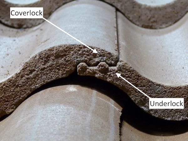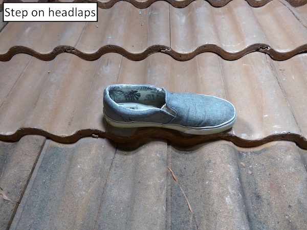 Inspectors walking tile should step on headlaps only, move carefully, avoid stepping on lower right corners (where interlocking tile is thinner). Fragility of tile varies with tile quality, installation method, and age. Walking tile fastened with foam or mortar adhesives may break the bonds.