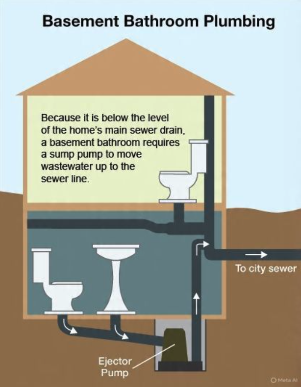 • Basement bathroom or laundry below the main sewer line with no visible ejector system.