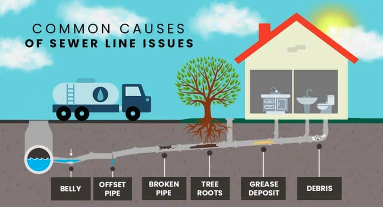 - Localized soggy soil, standing water, or a sunken trench/sinkhole along the suspected sewer line path.